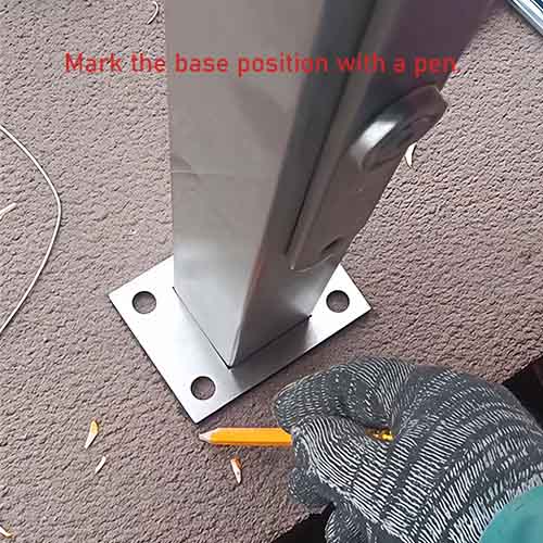 Place each stainless steel post on its mark so the post center matches the layout point;
