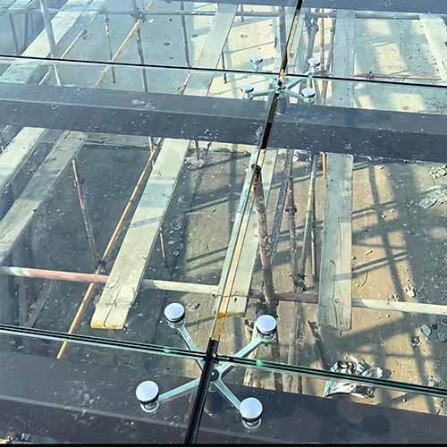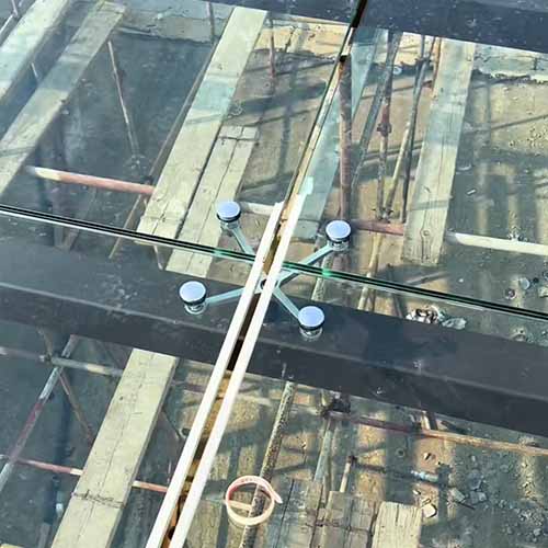 After that, glass routels are fixed to the spider fittings. Installers adjust them roughly according to the glass shop drawings and the position of the glass holes. Then the glass lifting process begins. Each glass panel is lifted by vacuum lifters, moved into place above the underground parking entrance and connected to the glass routels. During this operation, the team makes repeated checks on glass joint width, surface flatness and routel centering. If any deviation is found, they make small adjustments at the stainless steel spider fittings and glass routels until everything is in the correct position.