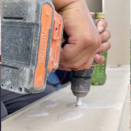 The Stone Layer: We start with a 12mm glass drill bit (diamond-tipped or carbide). This bit is designed to cut through the hard, brittle surface of the stone or tile without shattering it. We drill carefully until we penetrate the stone layer completely.