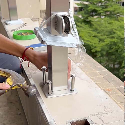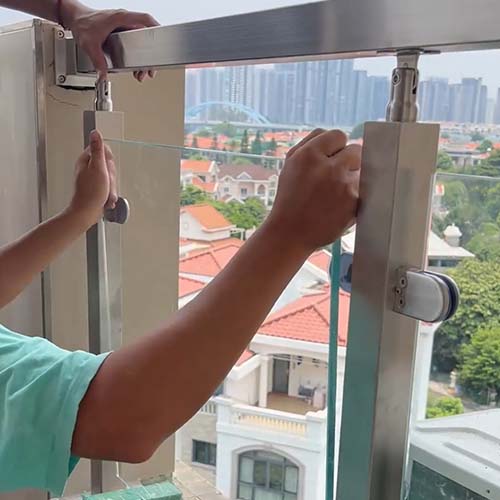 Setting the Glass: We carefully lift the tempered glass panels (usually 10mm or 12mm thick) and place them into the clamps between the posts.